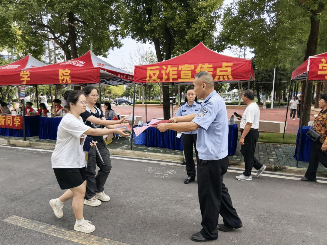 秋高气爽,丹桂飘香。9月15日,湖北大学知行学院迎来了2025级新生报到的日子。校园内人头攒动,洋溢着青春与喜悦的气氛。在繁忙而有序的迎新现场,一处特殊的“摊位”吸引了众多新生和家长的目光——这是由学校保卫处与谌家矶派出所联合设立的反诈宣传点,旨在为初入大学校园的新生们送上一份至关重要的“安全礼”。